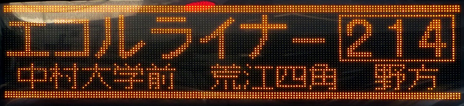 | 現存 |  | 行先: 214 エコルライナー・野方(営業所) 経由地: 中村大学前,荒江四角 表示区間: 雙葉学園入口→別府駅前 撮影日: 2019-05-23 公開日: 2020-01-14 撮影者: nnr_1510 備考: ★◆エコルライナー