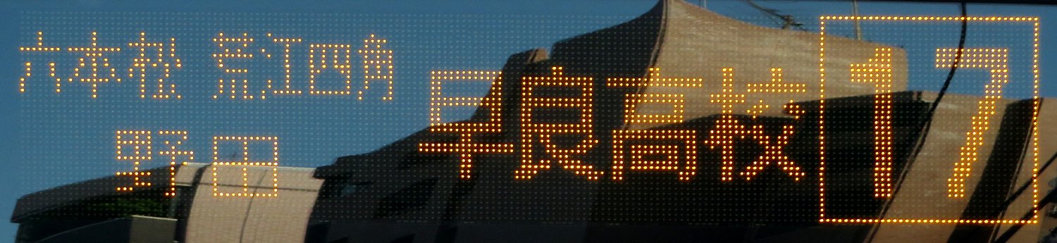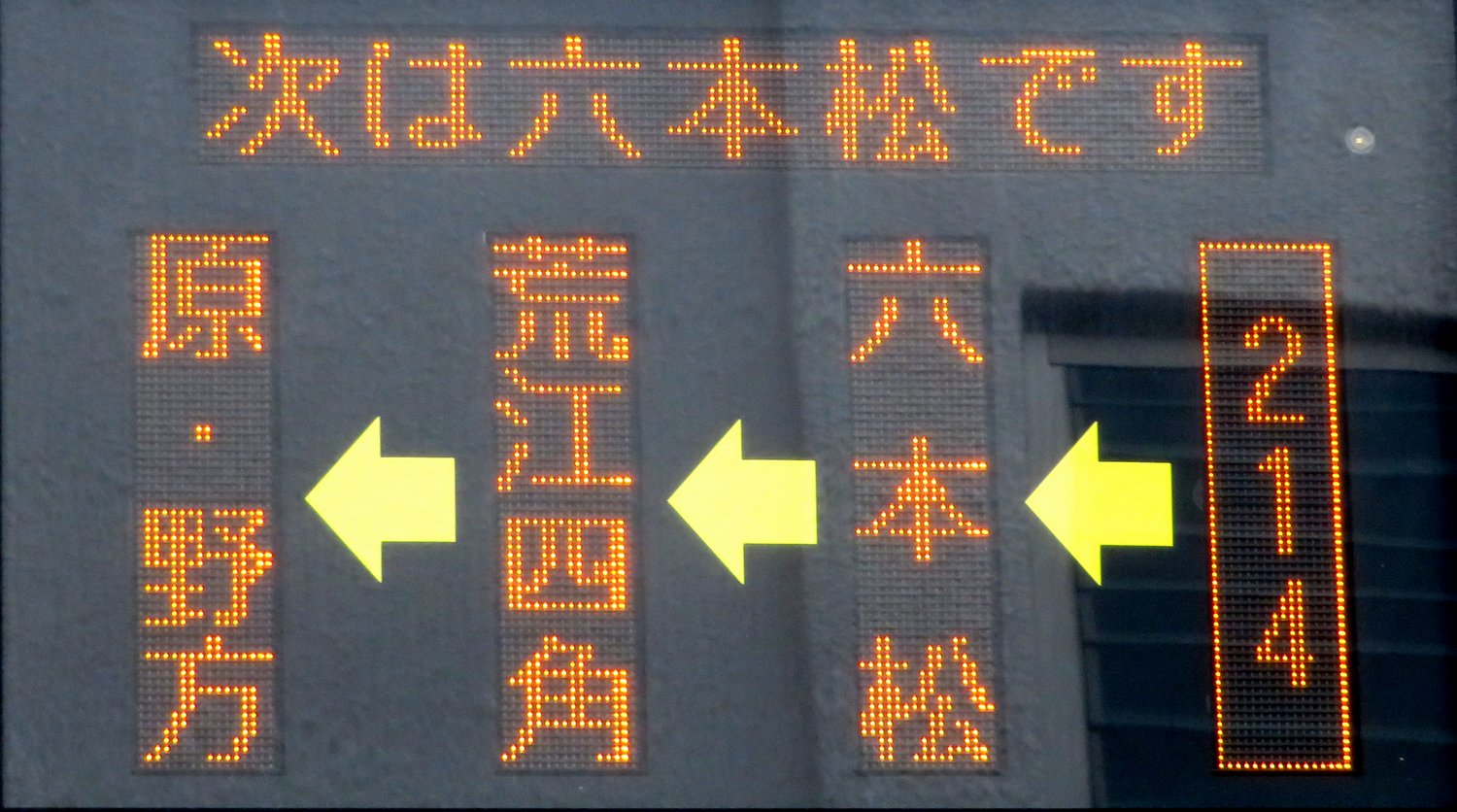 | 現存 |  | 行先: 214 エコルライナー・野方(営業所) 経由地: 214,六本松,荒江四角,原 表示区間: 雙葉学園入口のみ 撮影日: 2019-05-23 公開日: 2020-01-15 撮影者: nnr_1510 備考: ★◆エコルライナー/行先番号縦表記/次停留所案内:次は六本松です/中点表記