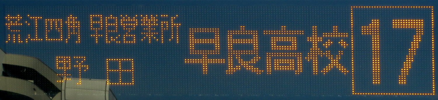 | 現存 |  | 行先: 17 早良高校 経由地: 荒江四角,早良営業所,野田 表示区間: 六本松(福銀前)→荒江団地 撮影日: 2019-05-23 公開日: 2020-01-21 撮影者: nnr_1510 備考: