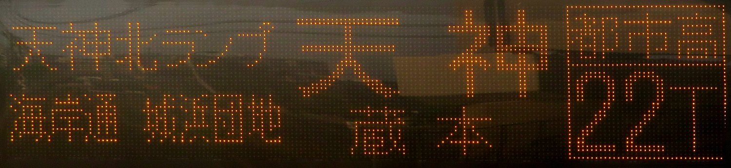 | 現存 |  | 行先: 22T 都市高 天神・蔵本(昭和通)B方面 経由地: 天神北ランプ,海岸通,城浜団地,天神,蔵本 表示区間: 香椎参道→香椎浜三丁目 撮影日: 2019-05-23 公開日: 2019-12-27 撮影者: nnr_1510 備考: ★★平日早朝1本のみ/土井営業所始発系統のみ表示