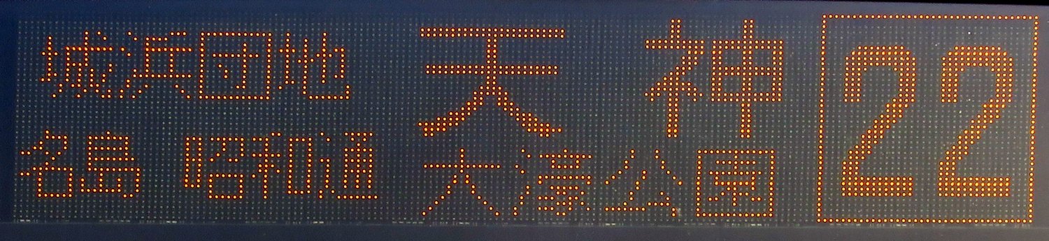 | 現存 |  | 行先: 22 大濠公園 経由地: 城浜団地,名島,昭和通,天神 表示区間: 香椎浜海岸通り→香椎浜二丁目 撮影日: 2019-05-23 公開日: 2020-01-05 撮影者: nnr_1510 備考: ■西鉄香椎始発系統のみ表示
