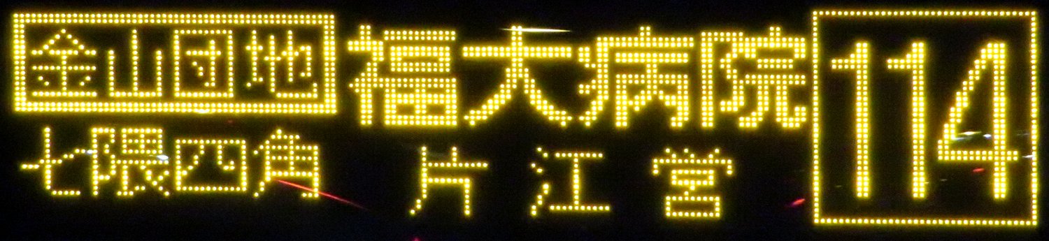 | 現存 |  | 行先: 114 片江営業所 経由地: 金山団地,七隈四角,福大病院 表示区間: 六本松(福銀前)→金山団地口? 撮影日: 2019-05-16 公開日: 2019-12-16 撮影者: nnr_1510 備考: 金山団地経由便/「金山団地」囲み表記