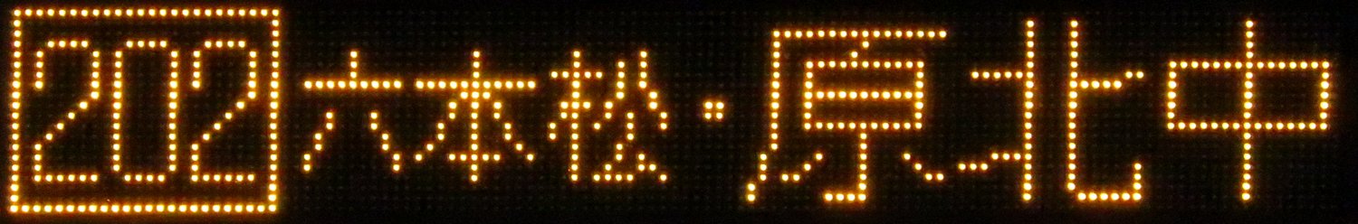 | 現存 |  | 行先: 202 原北中学校前 経由地: 六本松 表示区間: 博多バスターミナル→?? 撮影日: 2019-05-16 公開日: 2019-12-16 撮影者: nnr_1510 備考: 中点表記