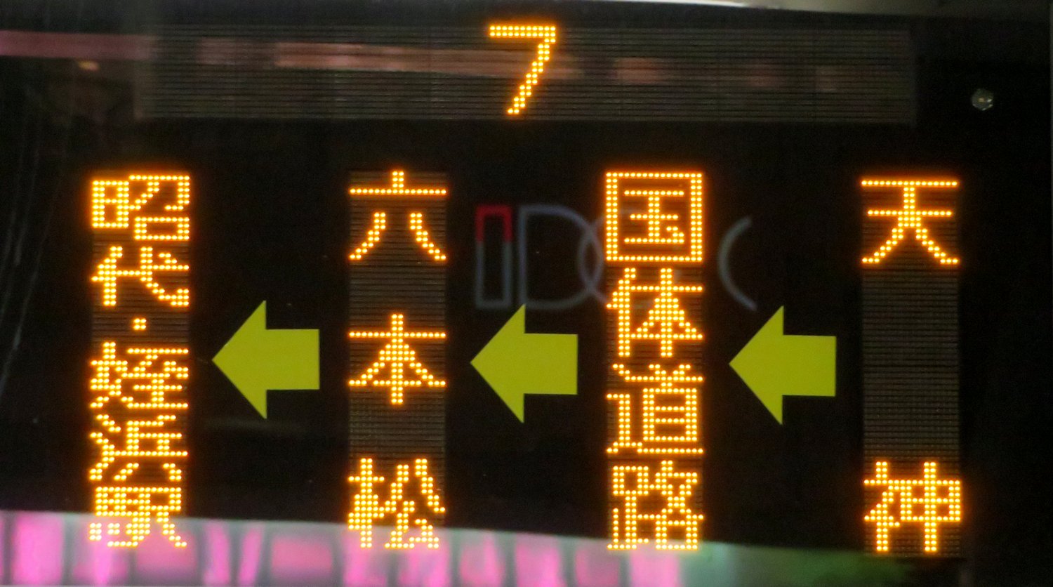 | 現存 |  | 行先: 7 姪浜駅南口 経由地: 天神,国体道路,六本松,昭代 表示区間: 川端町・博多座前→アクロス福岡・水鏡天満宮前 撮影日: 2019-05-16 公開日: 2019-12-13 撮影者: nnr_1510 備考: 中点表記
