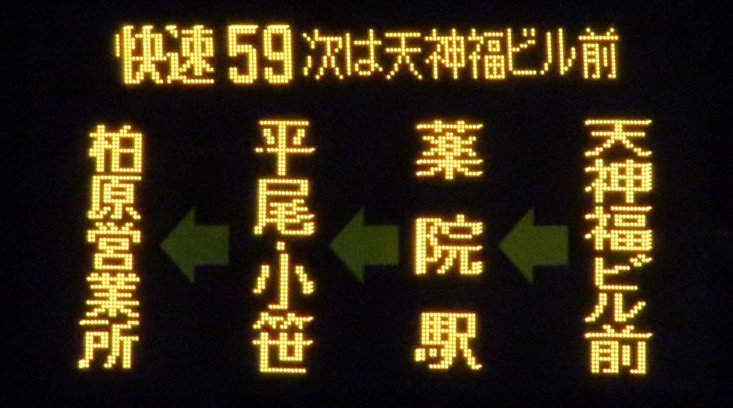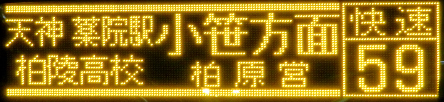| 現存 |  | 行先: 59 快速 柏原営業所 経由地: 天神福ビル前,薬院駅,平尾,小笹 表示区間: 川端町・博多座前のみ 撮影日: 2019-05-16 公開日: 2019-12-13 撮影者: nnr_1510 備考: ★後日再撮影(ドット欠け)/次停留所案内:次は天神福ビル前/中点表記