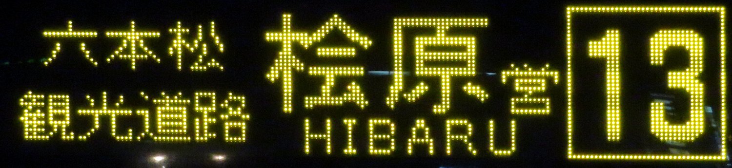 | 現存 |  | 行先: 13 桧原営業所 経由地: 六本松,観光道路 表示区間: 呉服町大島眼科H→アクロス福岡・水鏡天満宮前 撮影日: 2019-05-16 公開日: 2019-12-13 撮影者: nnr_1510 備考: 片江営業所運行便/ローマ字表記あり(HIBARU)