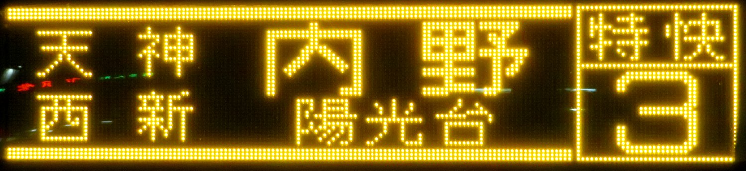 | 現存 |  | 行先: 3 特快 陽光台 経由地: 天神,西新,内野 表示区間: 博多バスターミナル→川端町・博多座前 撮影日: 2019-05-16 公開日: 2019-12-13 撮影者: nnr_1510 備考: 上下ライン