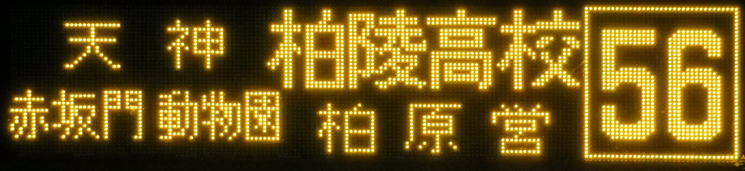 | 現存 |  | 行先: 56 柏原営業所 経由地: 天神,赤坂門,動物園,柏陵高校 表示区間: 川端町・博多座前→アクロス福岡・水鏡天満宮前 撮影日: 2019-05-16 公開日: 2019-12-13 撮影者: nnr_1510 備考: