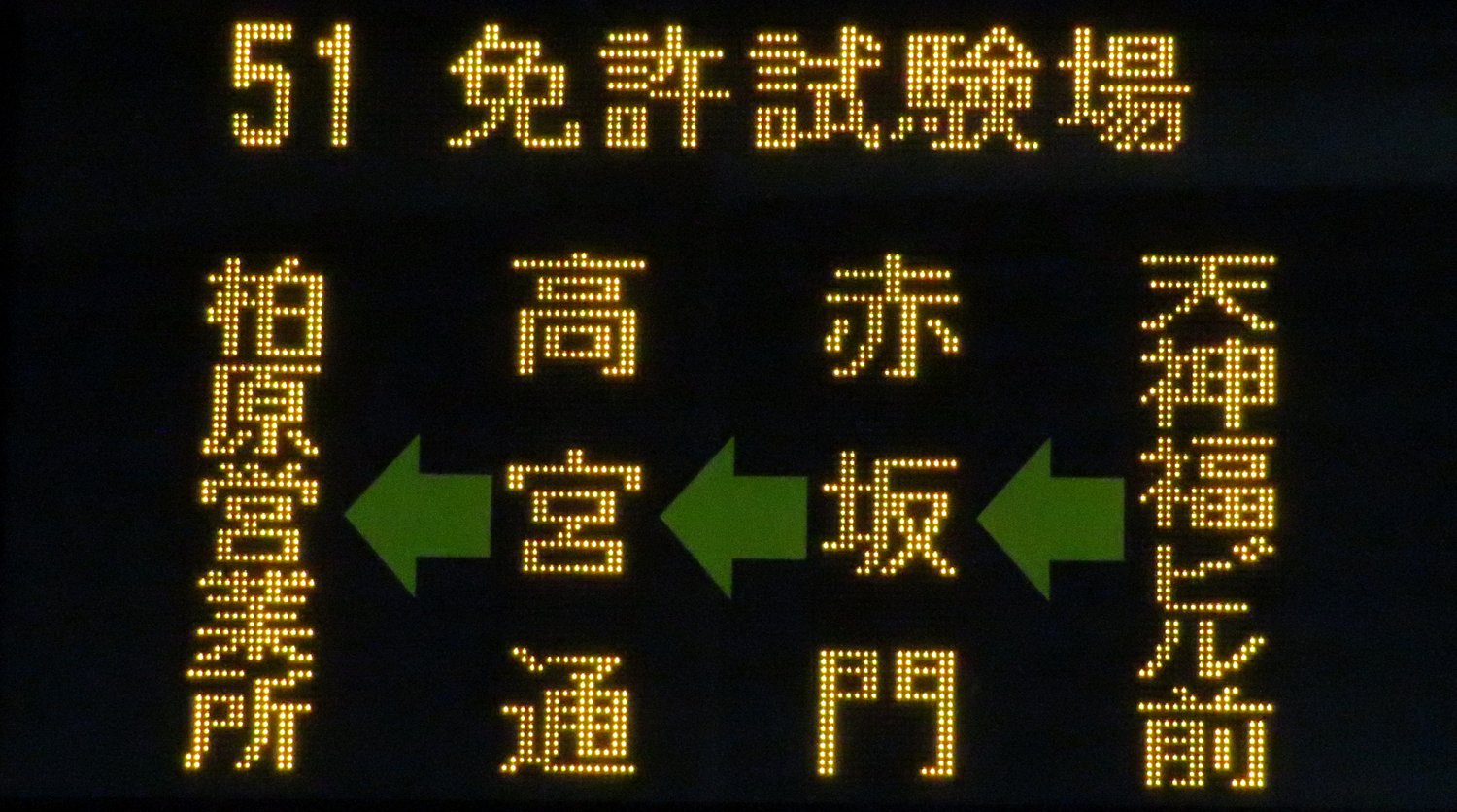 | 消滅 |  | 行先: 51 柏原営業所 経由地: 天神福ビル前,赤坂門,高宮通,免許試験場 表示区間: 川端町・博多座前→アクロス福岡・水鏡天満宮前 撮影日: 2019-06-12 公開日: 2020-05-09 撮影者: nnr_1510 備考: 行先番号欄経由地表記/2020.03.21改正で消滅(天神福ビル前改称に伴い)