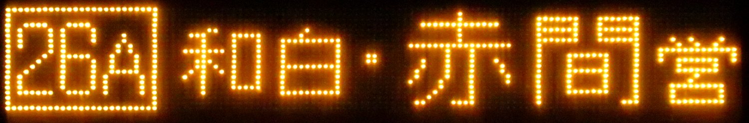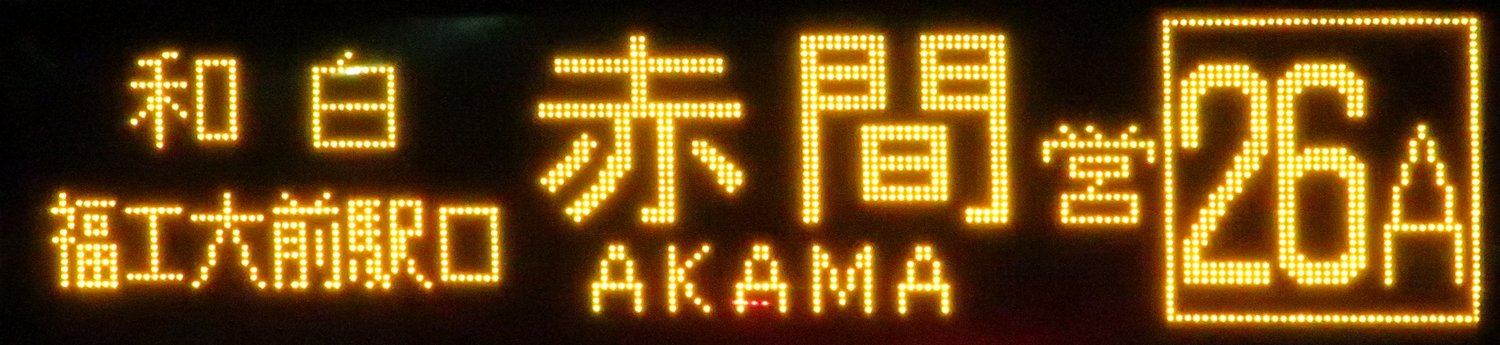 | 現存 |  | 行先: 26A 赤間営業所 経由地: 和白 表示区間: 福岡女子大前→白浜 撮影日: 2019-05-16 公開日: 2019-12-11 撮影者: nnr_1510 備考: 中点表記