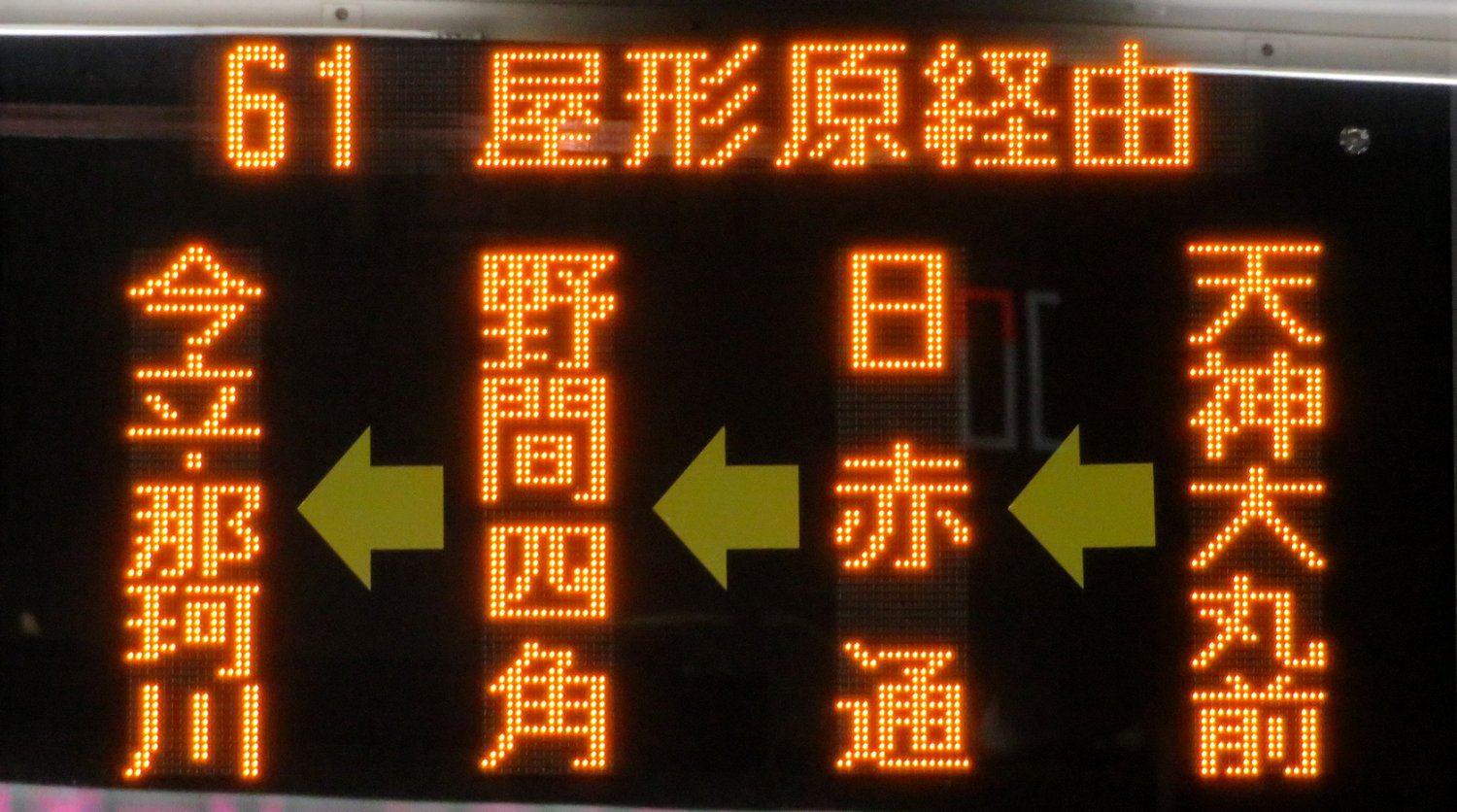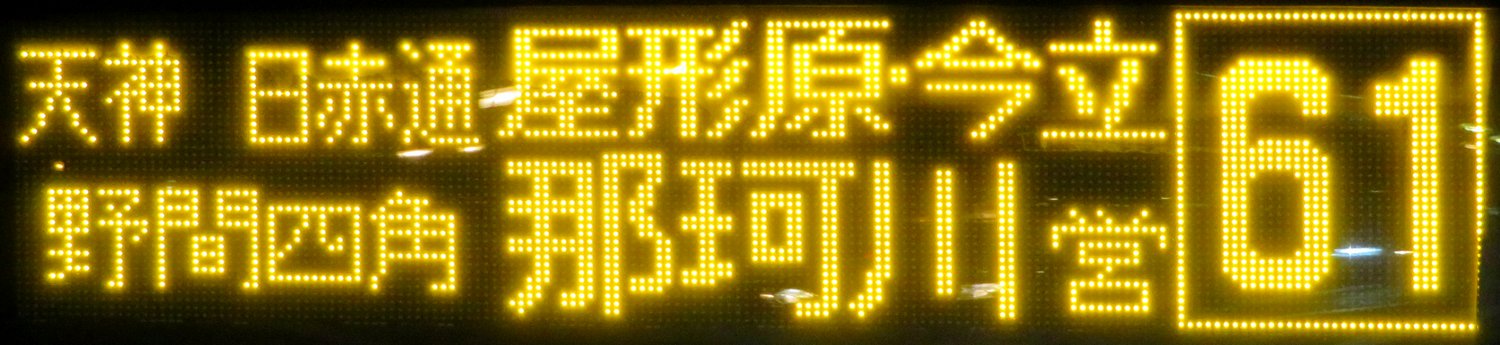 | 現存 |  | 行先: 61 今立・那珂川営業所 経由地: 天神,日赤通,野間四角,屋形原,今立 表示区間: 呉服町大島眼科H→東中洲 撮影日: 2019-05-17 公開日: 2019-12-11 撮影者: nnr_1510 備考: 今立経由便/中点表記/二段表記