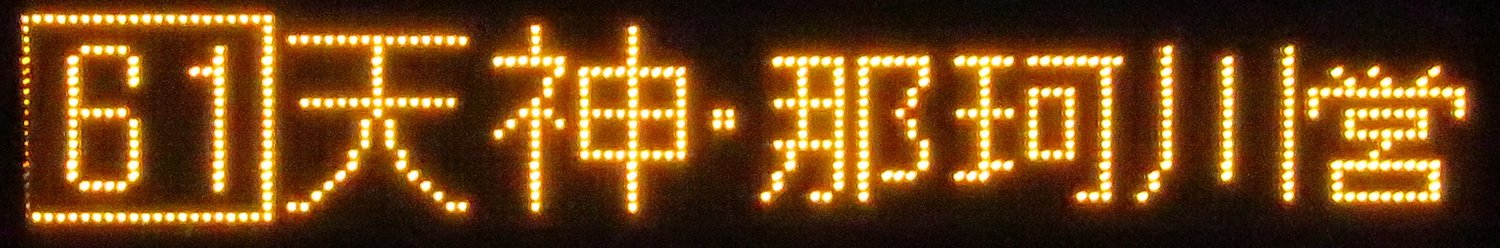 | 現存 |  | 行先: 71 大濠公園 経由地: 天神 表示区間: 巴町→アクロス福岡・水鏡天満宮前 撮影日: 2019-05-17 公開日: 2019-12-11 撮影者: nnr_1510 備考: 中点表記