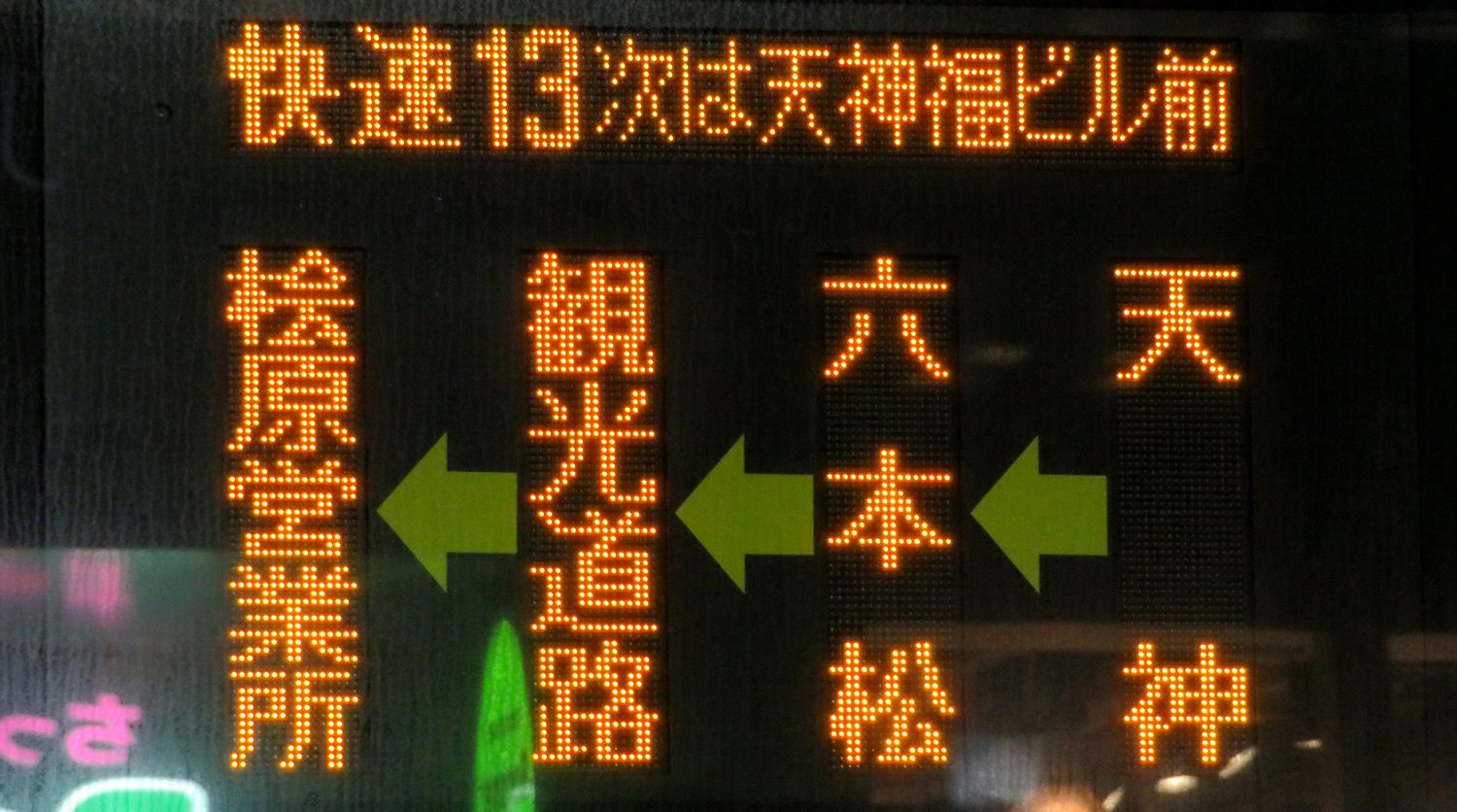 | 消滅 |  | 行先: 13 快速 桧原営業所 経由地: 天神,六本松,観光道路 表示区間: 川端町・博多座前のみ 撮影日: 2019-05-17 公開日: 2019-12-11 撮影者: nnr_1510 備考: 次停留所案内:次は天神福ビル前/2020.03.21改正で消滅(天神福ビル前改称に伴い)