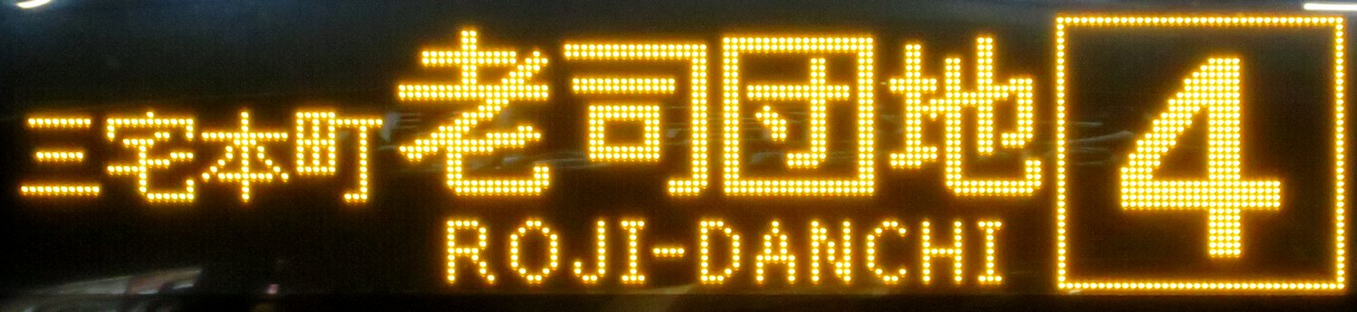| 現存 |  | 行先: 4 老司団地(1) 経由地: 三宅本町 表示区間: 西鉄大橋駅→地禄神社 撮影日: 2019-11-25 公開日: 2020-06-08 撮影者: nnr_1510 備考: ローマ字表記あり(ROJI-DANCHI)