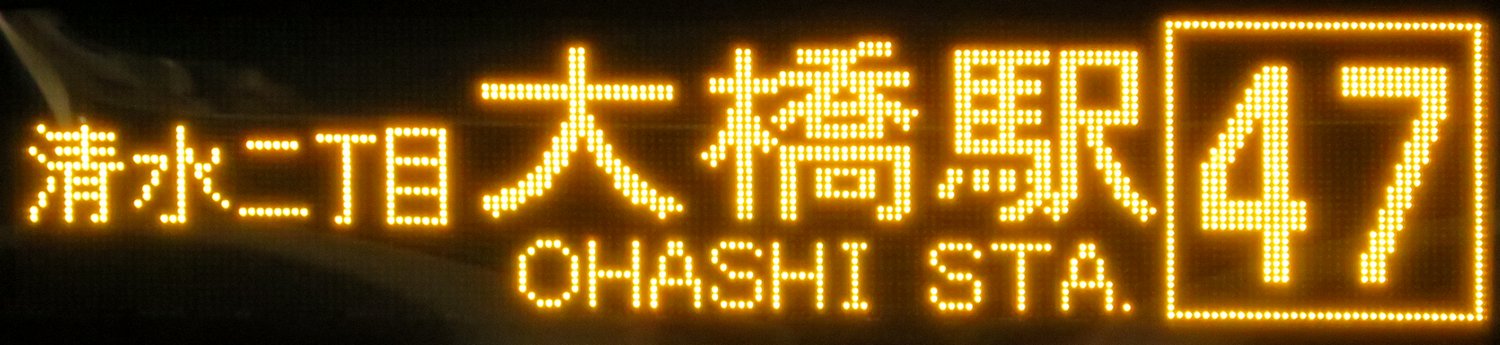 | 現存 |  | 行先: 47 西鉄大橋駅 経由地: 清水二丁目 表示区間: 美野島一丁目→西鉄大橋駅 撮影日: 2019-11-25 公開日: 2020-06-08 撮影者: nnr_1510 備考: ★■博多駅前A始発便のみ表示/ローマ字表記あり(OHASHI STA.)