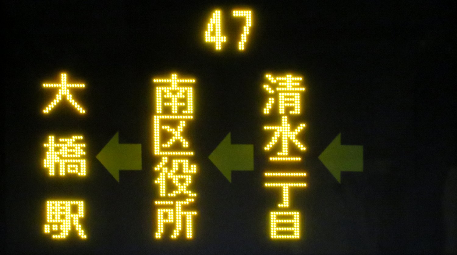 | 現存 |  | 行先: 47 西鉄大橋駅 経由地: 清水二丁目,南区役所 表示区間: 美野島一丁目→西鉄大橋駅 撮影日: 2019-11-25 公開日: 2020-06-08 撮影者: nnr_1510 備考: ★■博多駅前A始発便のみ表示