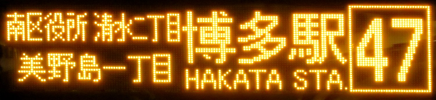 | 現存 |  | 行先: 47 博多駅西日本シティ銀行前F 経由地: 南区役所,清水二丁目,美野島一丁目 表示区間: 西鉄大橋駅のみ 撮影日: 2019-11-25 公開日: 2020-06-08 撮影者: nnr_1510 備考: ローマ字表記あり(HAKATA STA.)