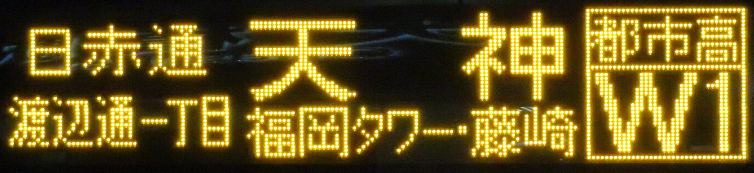 | 現存 |  | 行先: W1 都市高 藤崎 経由地: 日赤通,渡辺通一丁目,天神,福岡タワー 表示区間: 西鉄大橋駅→高砂 撮影日: 2019-11-25 公開日: 2020-06-10 撮影者: nnr_1510 備考: 中点表記