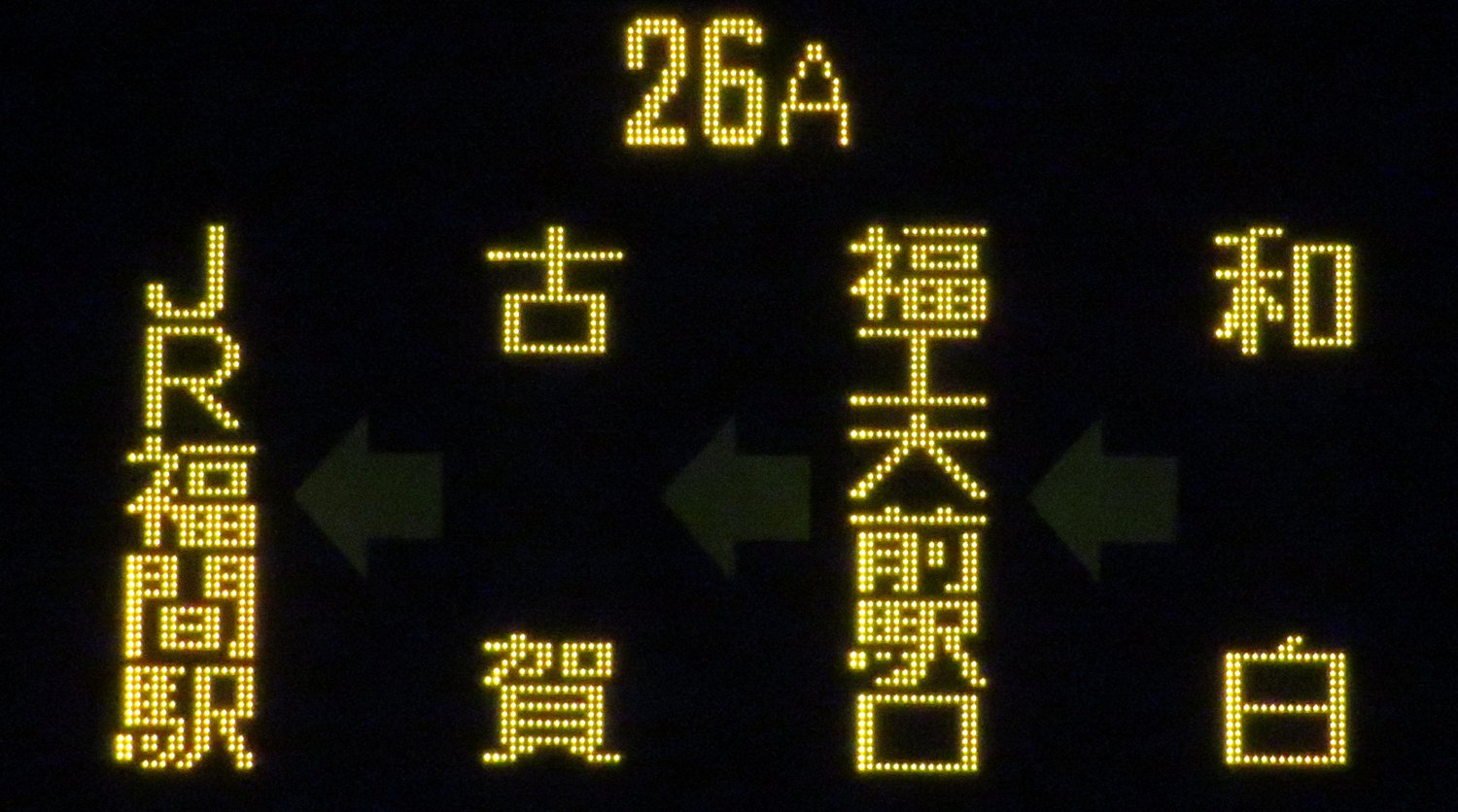 | 現存 |  | 行先: 26A 光陽台六丁目 経由地: 和白,福工大前駅口,古賀,JR福間駅 表示区間: 福岡女子大前→白浜 撮影日: 2019-05-16 公開日: 2019-12-09 撮影者: nnr_1510 備考: 行先表記なし