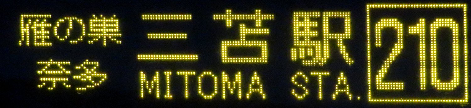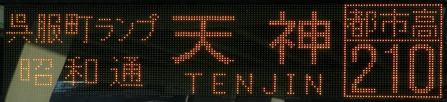 | 現存 |  | 行先: 210 都市高 天神三丁目(15) 経由地: 呉服町ランプ,昭和通 表示区間: 照葉小中学校前→イオンモール香椎浜 撮影日: 2019-11-16 公開日: 2020-05-17 撮影者: nnr_1510 備考: ローマ字表記あり(TENJIN)