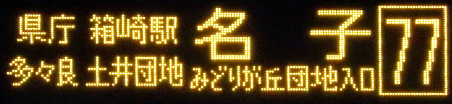 | 現存 |  | 行先: 77 みどりが丘団地入口 経由地: 県庁,箱崎駅,多々良,土井団地,名子 表示区間: 天神大和証券前(14)→千代町(自治会館) 撮影日: 2019-05-16 公開日: 2019-12-09 撮影者: nnr_1510 備考: