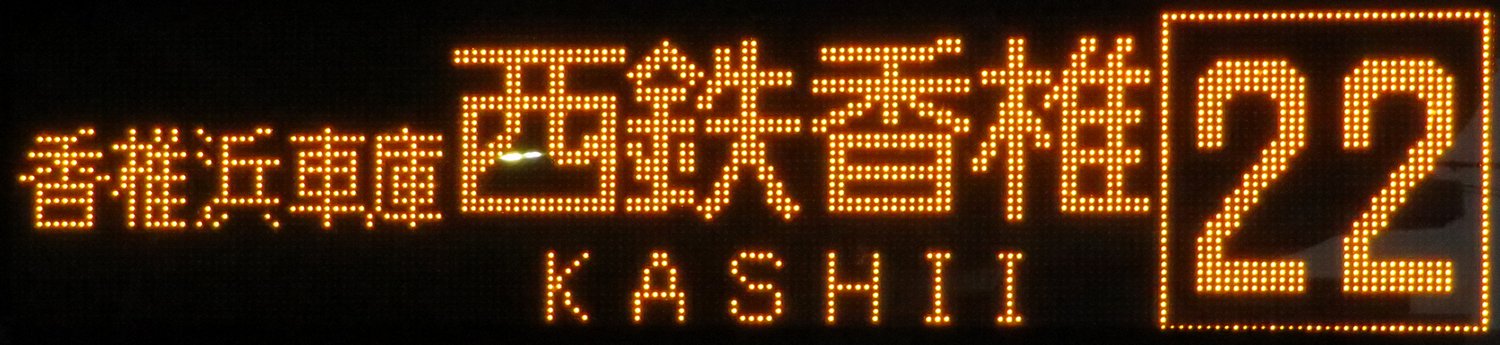| 現存 |  | 行先: 22 西鉄香椎 経由地: 香椎浜車庫 表示区間: 香椎浜海岸通り→イオンモール香椎浜 撮影日: 2019-05-15 公開日: 2019-12-06 撮影者: nnr_1510 備考: ローマ字表記あり(KASHII)