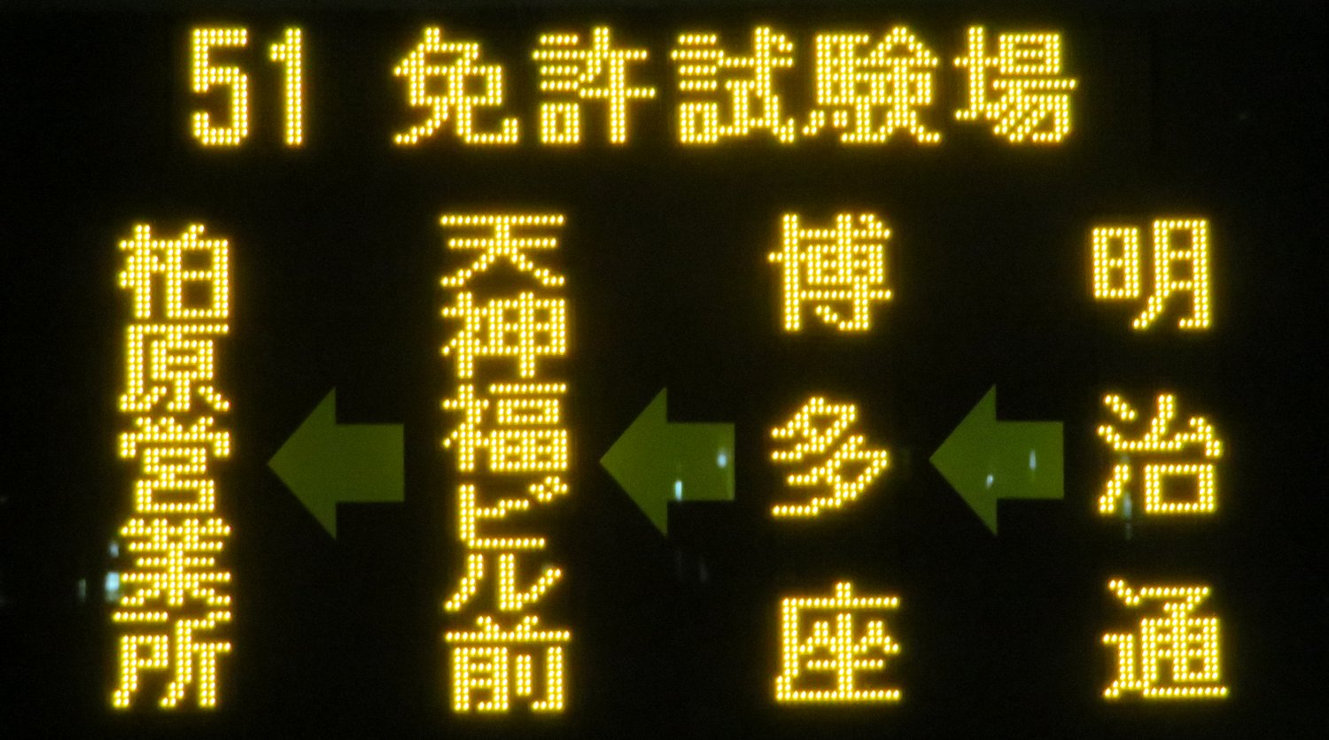 | 消滅 |  | 行先: 51 柏原営業所 経由地: 明治通,博多座,天神福ビル前,免許試験場 表示区間: 吉塚営業所/九大病院/吉塚駅(構内)→土居町 撮影日: 2019-05-13 公開日: 2019-12-05 撮影者: nnr_1510 備考: 行先番号欄経由地表記/2020.03.21改正で消滅(天神福ビル前改称に伴い)
