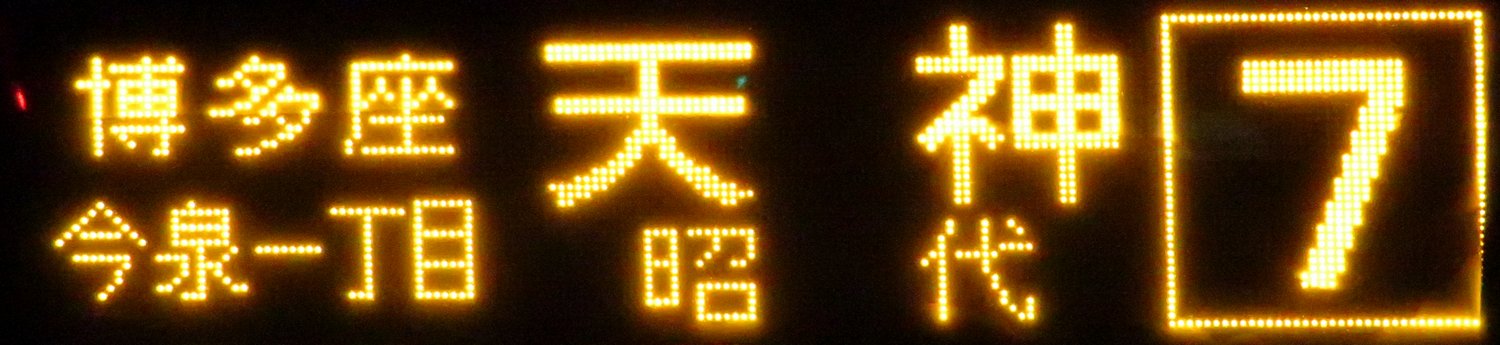 | 現存 |  | 行先: 7 姪浜駅南口 経由地: 明治通,博多座,天神,昭代 表示区間: 吉塚営業所→土居町 撮影日: 2019-05-13 公開日: 2019-12-05 撮影者: nnr_1510 備考: 中点表記