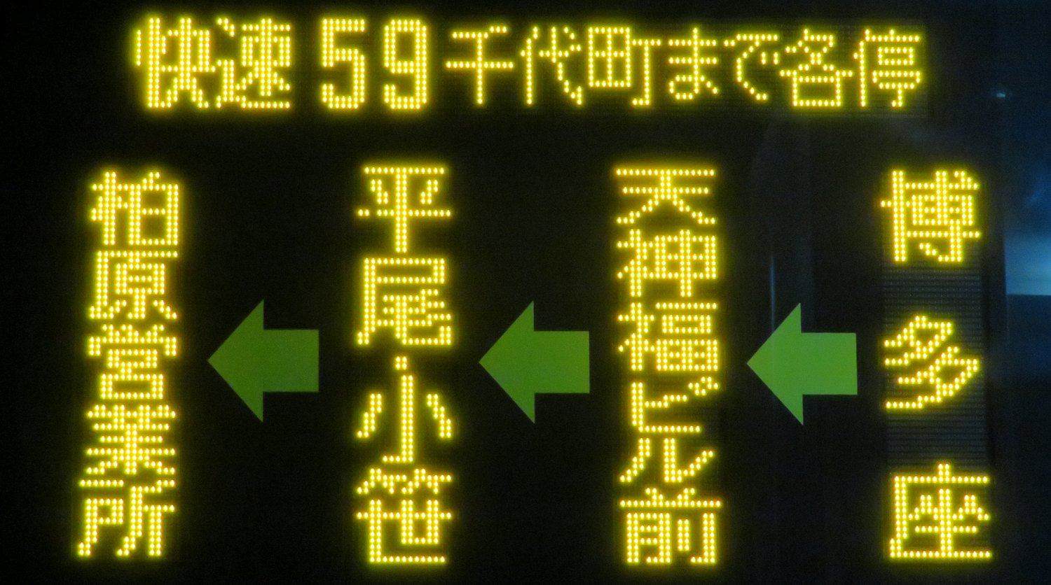 | 現存 |  | 行先: 59 快速 柏原営業所 経由地: 博多座,天神福ビル前,平尾,小笹 表示区間: 吉塚営業所/九大前→県庁前 撮影日: 2019-05-13 公開日: 2019-12-05 撮影者: nnr_1510 備考: ★後日再撮影(ドット欠け)/「千代町まで各停」表記