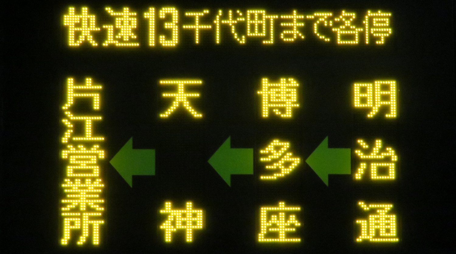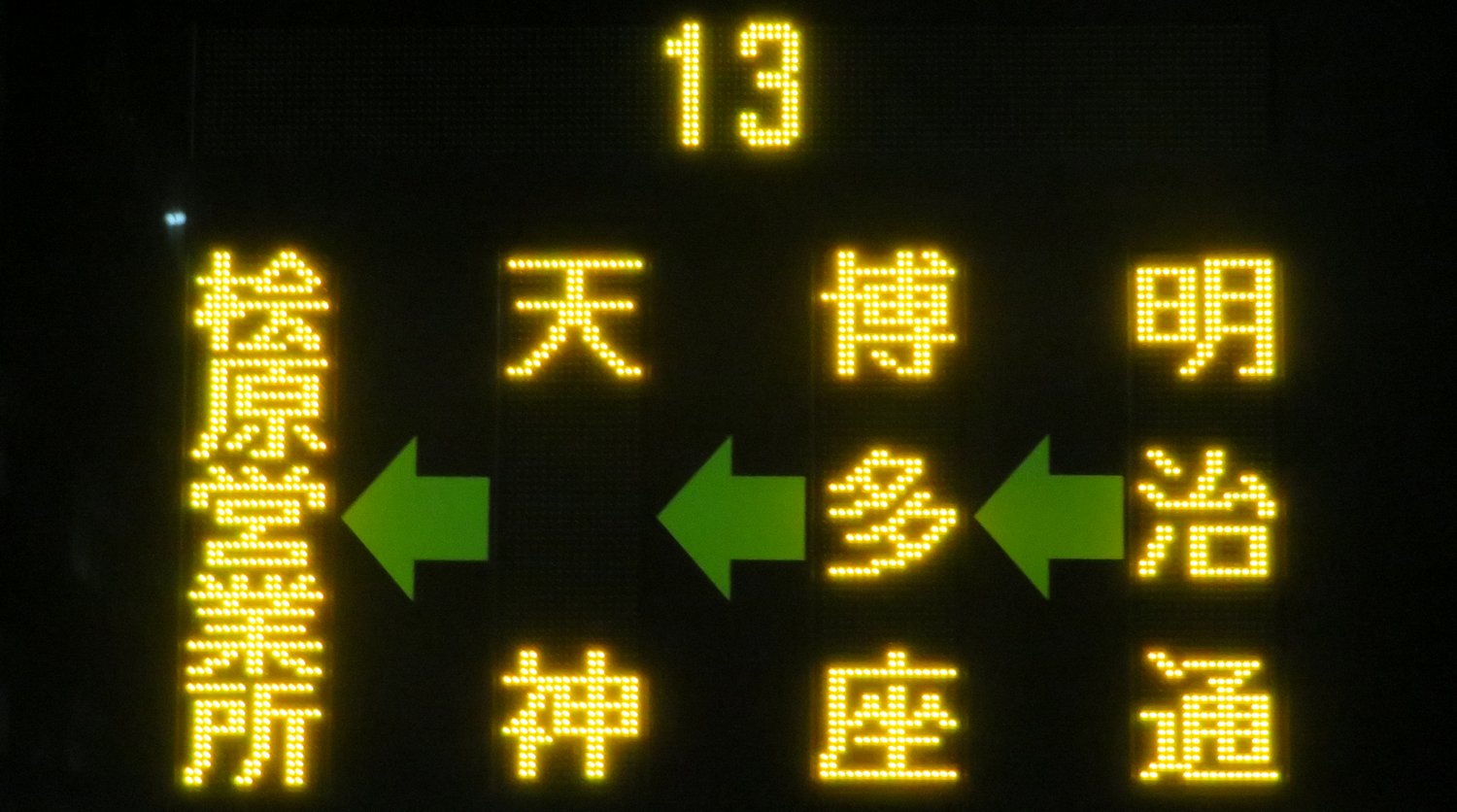 | 現存 |  | 行先: 13 快速 桧原営業所 経由地: 明治通,博多座,天神 表示区間: 吉塚営業所→県庁前 撮影日: 2019-05-13 公開日: 2019-12-05 撮影者: nnr_1510 備考: 「千代町まで各停」表記