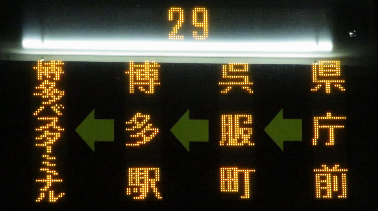 | 現存 |  | 行先: 29 博多バスターミナル1F 経由地: 県庁前,呉服町,博多駅 表示区間: 名島→警察本部前・九大病院入口 撮影日: 2019-05-13 公開日: 2019-12-05 撮影者: nnr_1510 備考: ■アイランドシティ照葉始発系統のみ馬出通りまで当表示。警察本部前・九大病院入口から次表示