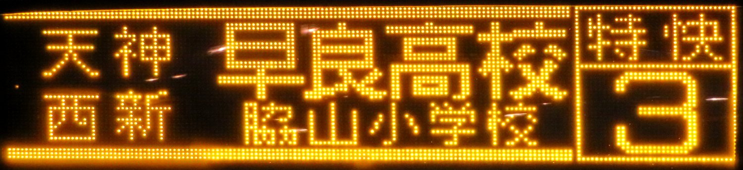 | 現存 |  | 行先: 3 特快 脇山小学校 経由地: 天神,西新,早良高校 表示区間: 博多バスターミナル→川端町・博多座前 撮影日: 2019-05-13 公開日: 2019-12-05 撮影者: nnr_1510 備考: 上下ライン
