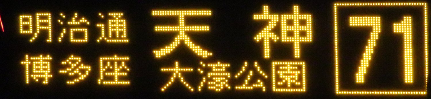 | 現存 |  | 行先: 71 大濠公園 経由地: 明治通,博多座,天神 表示区間: 巴町→土居町 撮影日: 2019-05-13 公開日: 2019-12-05 撮影者: nnr_1510 備考: 77・78番大濠公園行きは県庁前から、79番大濠公園行きは蓮池から連続運行