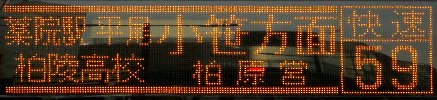 | 現存 |  | 行先: 59 快速 柏原営業所 経由地: 薬院駅,平尾,柏陵高校,小笹 表示区間: 天神福ビル前(12)→渡辺通一丁目十八銀行前F 撮影日: 2019-05-11 公開日: 2019-12-03 撮影者: nnr_1510 備考: ★上下ライン/方面表記