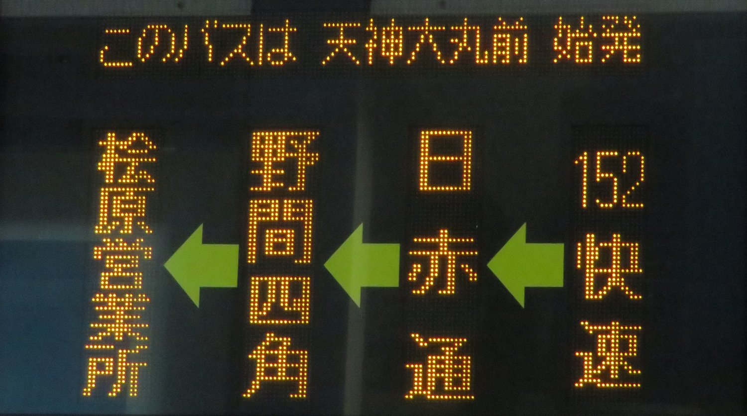 | 現存 |  | 行先: 152 快速 桧原営業所 経由地: 野間四角,長住三丁目 表示区間: 日赤前→清水町(野間・長住・皿山・若久方面) 撮影日: 2019-05-11 公開日: 2019-12-03 撮影者: nnr_1510 備考: ■上下ライン/福岡タワー始発系統のみ別表示あり/ローマ字表記あり(HIBARU)